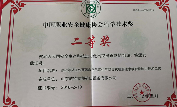 • 濟寧市首屆創新大賽“煤礦采掘面濕噴除塵系統設備”創新組二等獎